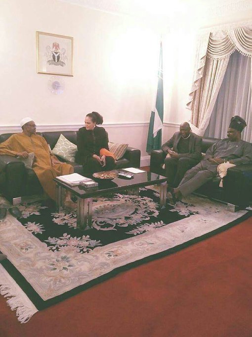 In the picture shared by the All Progressives Congress (APC) London chapter via its Twitter page, the president was seen dicussing with Senator Daisy Danjuma while Ogun state governor, Ibikunle Amosun and the president's chief of staff, Abba Kyari were also present in the room.